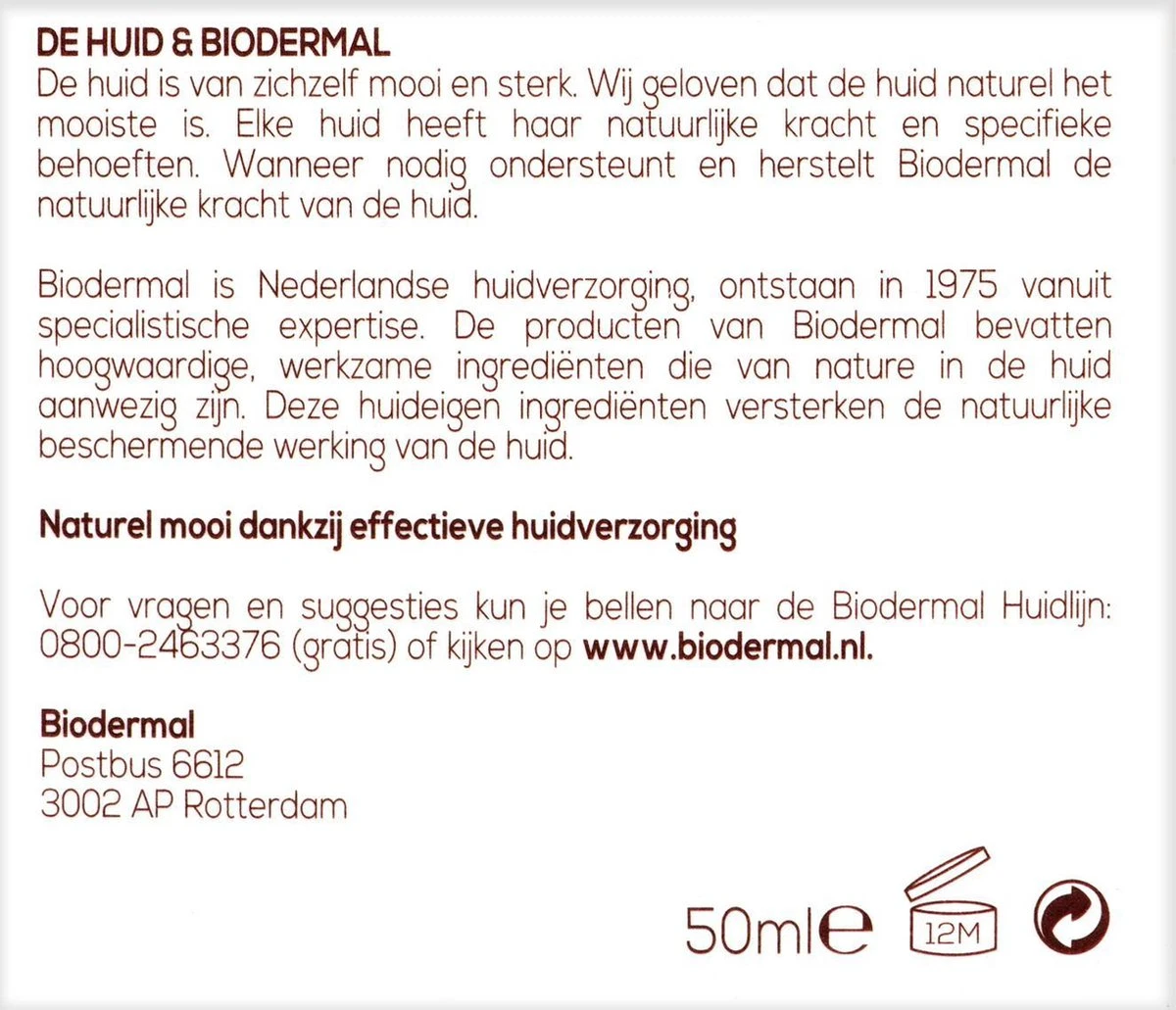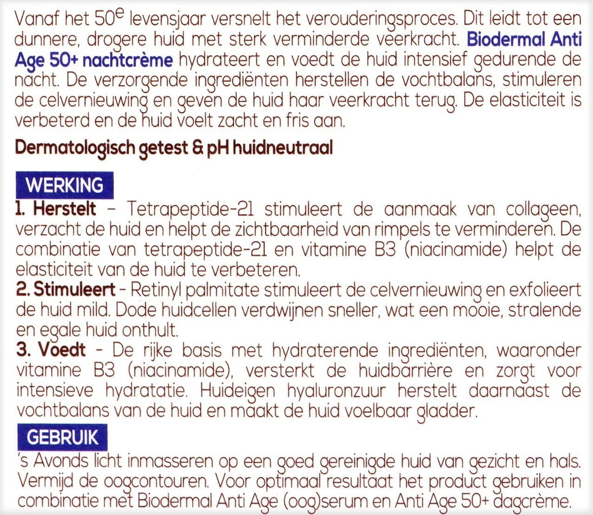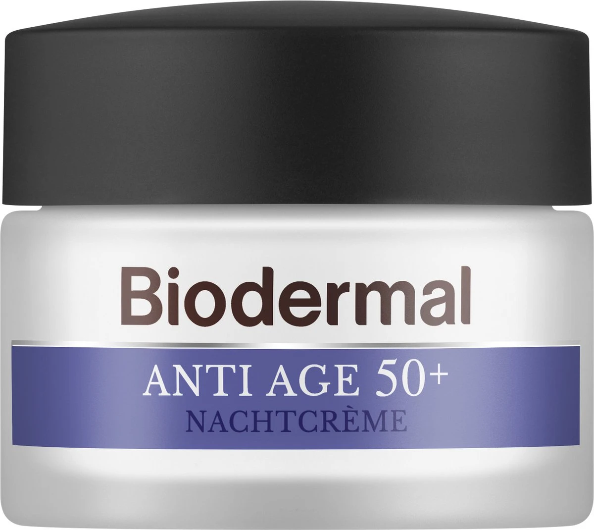 Het verouderingsproces versnelt vanaf het 50e levensjaar wat leidt tot een drogere en dunnere huid met sterk verminderde veerkracht. Biodermal Anti Age 50+ nachtcrème voedt en hydrateert de huid intensief gedurende de nacht en ondersteunt zo een optimaal huidherstel. De effectieve en verzorgende ingrediënten stimuleren de aanmaak van verstevigend collageen, herstellen de vochtbalans en geven de huid haar veerkracht terug. De crème verbetert daarnaast de huidelasticiteit en vermindert de zichtbaarheid van rimpels en pigmentvlekjes. Met als resultaat een stralende huid die steviger en soepeler is.