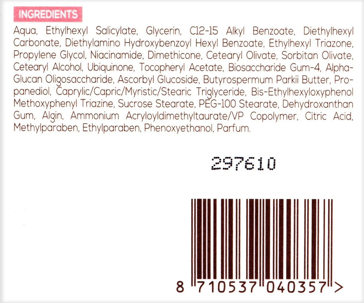Ingrediënten:Aqua, Ethylhexyl Salicylate, Glycerin, C12-15 Alkyl Benzoate, Diethylhexyl Carbonate, Diethylamino Hydroxybenzoyl Hexyl Benzoate, Ethylhexyl Triazone, Propylene Glycol, Niacinamide, Dimethicone, Cetearyl Olivate, Sorbitan Olivate, Cetearyl Alcohol, Ubiquinone, Tocopheryl Acetate, Biosaccharide Gum-4, Alpha-Glucan Oligosaccharide, Ascorbyl Glucoside, Butyrospermum Parkii Butter, Propanediol, Caprylic/Capric/Myristic/Stearic Triglyceride, Bis-Ethylhexyloxyphenol Methoxyphenyl Triazine, Sucrose Stearate, PEG-100 Stearate, Dehydroxanthan Gum, Algin, Ammonium Acryloyldimethyltaurate/VP Copolymer, Citric Acid, Methylparaben, Ethylparaben, Phenoxyethanol, Parfum.