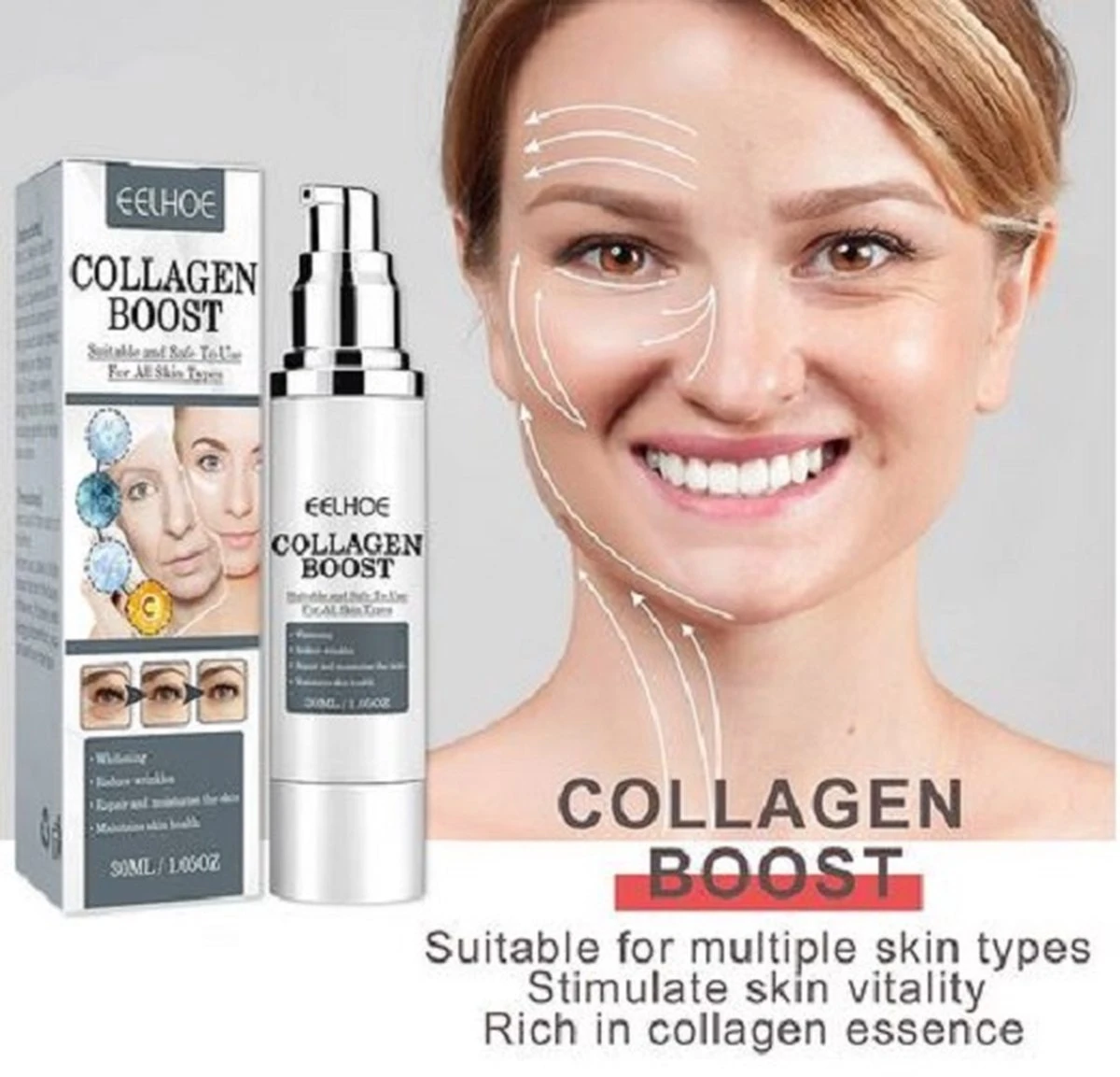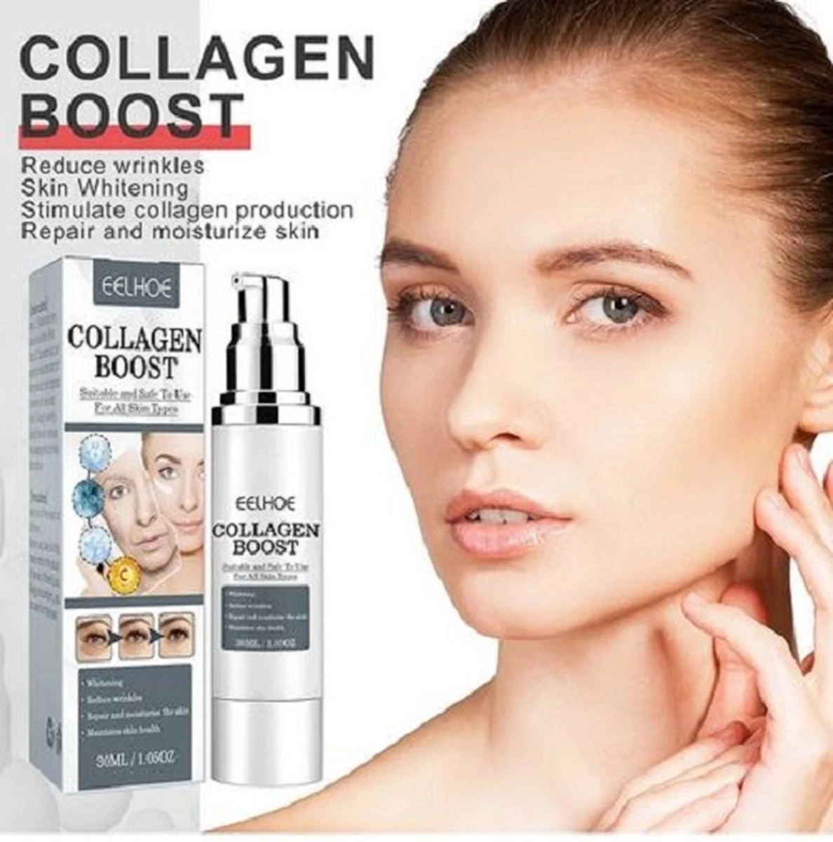 Collagen Boost: Colagen Boost crème helpt bij donkere vlekken, hyperpigmentatie, melasma, zonnevlekken, levervlekken, sproeten, ongelijk pigment te bestrijden, vermindert acnelittekens, fijne lijntjes en rimpels.