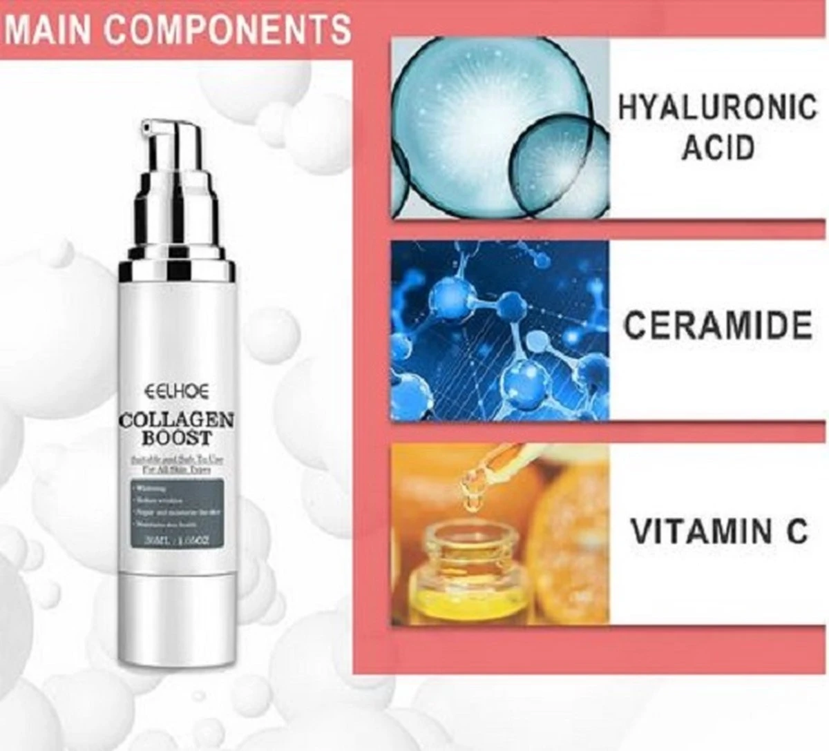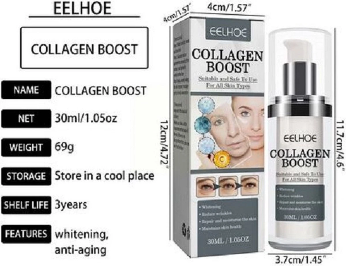 Collagen Boost Anti Aging Serum: kan huidverouderingsproblemen oplossen, zoals fijne lijntjes en rimpels, kraaienpootjes, droge huid, doffe huid of onregelmatige huidtint. Al na enige keren gebruik zie je al een verbetering van je huid.