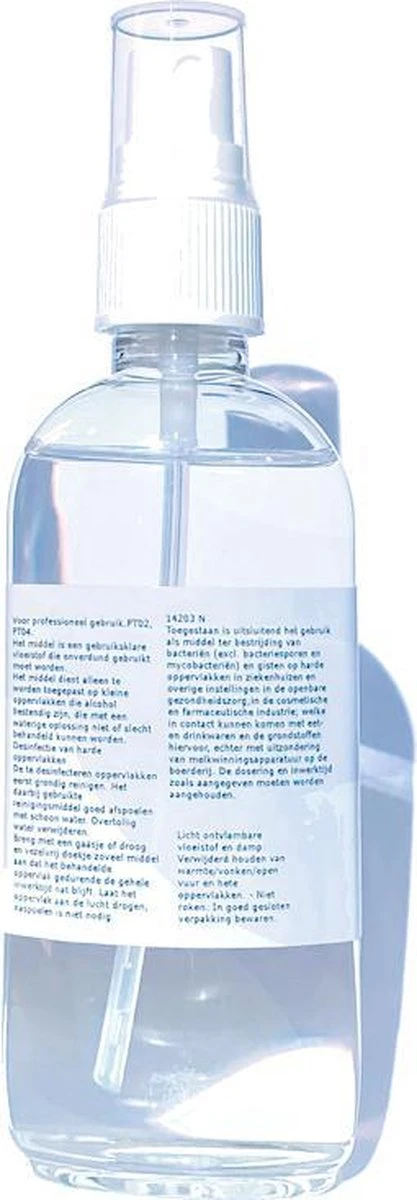 Dermarolling Desinfectie Alcohol 80% – 100ml. Met spray kop. Exclusief ontwikkeld voor het desinfecteren van onze dermarollers. Deze desinfecterende en antibacteriële alcohol kunt u gebruiken als ontsmettingsmiddel voor oppervlakken en medische instrumenten (behalve optische instrumenten) Voor Professioneel gebruik. PT02, PT04. Het middel is een gebruiksklare vloeistof die onverdund gebruikt moet worden. De Dermarolling Desinfectie Spray dient alleen te worden toegepast op kleine oppervlakken die alcohol bestendig zijn, die met een waterige oplossing niet of slecht behandeld kunnen worden. Desinfectie van harde oppervlakken eerst grondig reinigen. Het daarbij gebruikte reinigingsmiddel goed afspoelen met schoon water. Overtollig water verwijderen. Breng met een gaasje of droog en vezelvrij doekje zoveel midden aan het behandelde oppervlak dat het gedurende de gehele inwerktijd nat blijft. Laat het drogen, naspoelen is niet nodig.