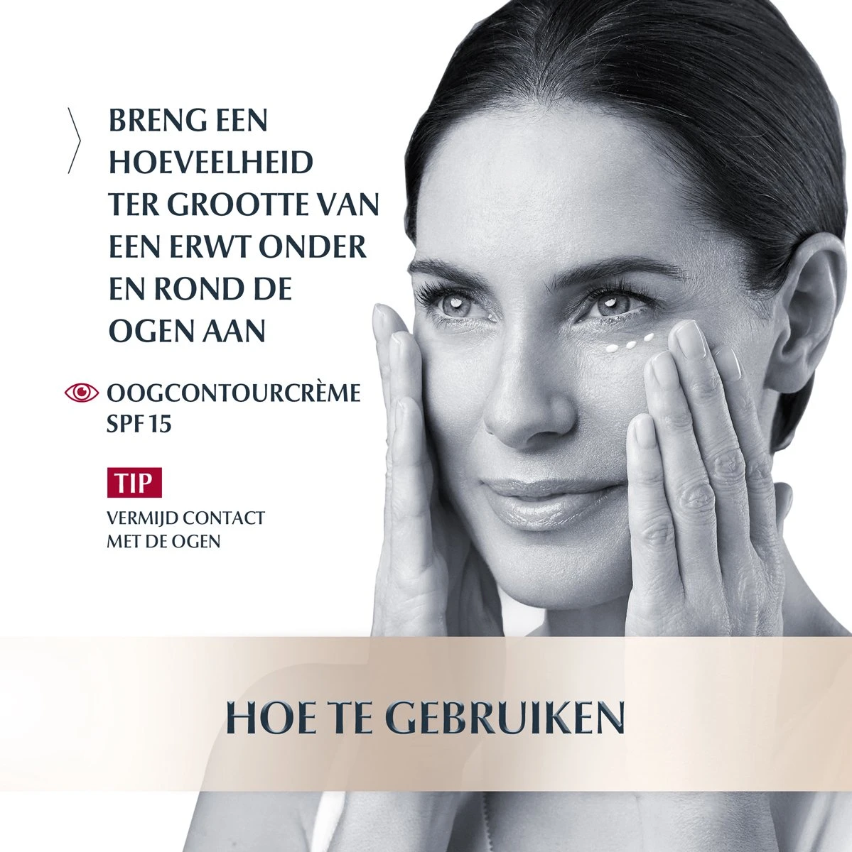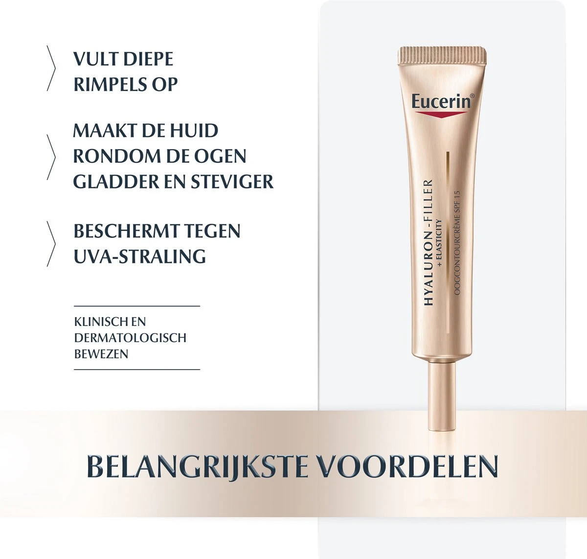 Eucerin Hyaluron-Filler + Elasticity Oogcrème is een anti-age oogcrème met SPF15. Je huid krijgt weer een frisse en opgewekte teint doordat rimpels worden opgevuld en de huid rond de ogen weer wordt versoepeld.