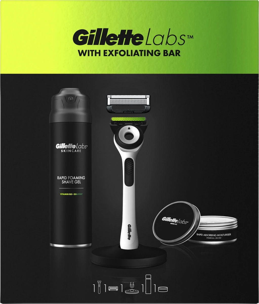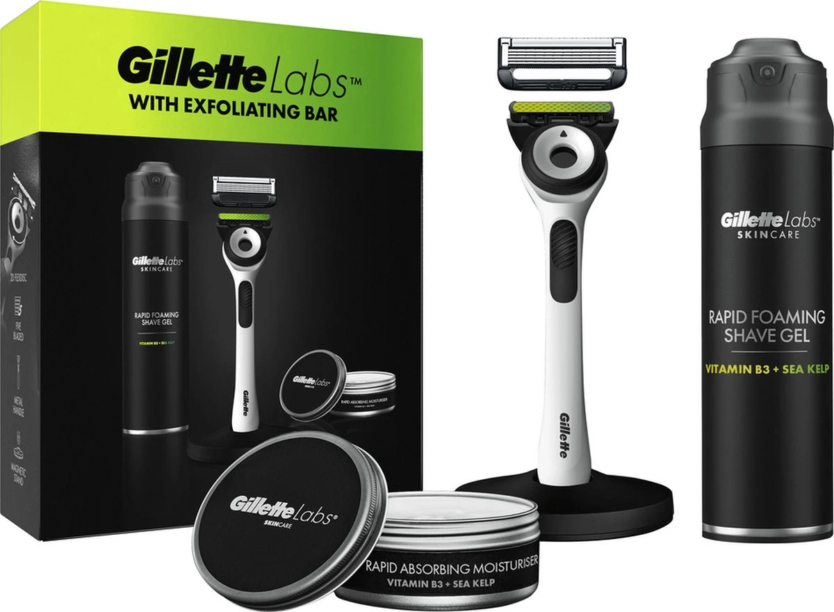 Ontdek de geweldige geschenksets van GilletteLabs voor mannen. Deze geschenkdoos bevat 1 GilletteLabs With Exfoliating Bar handvat + 1 navulmesje. 1 Snel Schuimende Scheergel (198ml) en 1 Snel Absorberende Hydraterende Crème (100ml). GilletteLabs With Exfoliating Bar is het eerste scheersysteem ter wereld met exfoliatietechnologie in het handvat dat exfoliërt en scheert in één beweging. De exfoliërende strip maakt het pad vrij voor de mesjes. De 2D FlexDisc-technologie volgt je gezicht voor comfort en contact bij elke beweging. Dit scheersysteem heeft 5 scherpe mesjes van Gillette en is ontworpen voor een snelle en eenvoudige scheerbeurt. Gebruik samen met de GilletteLabs verzorgingsproducten voor een gemakkelijke en verzorgende scheerbeurt zonder moeite. Het handvat van het scheersysteem wordt geleverd met een magnetische houder en heeft een levenslange garantie. Gebruik met GilletteLabs navulmesjes die ook geschikt zijn voor het Gillette Heated Razor. Bezoek : moneyback-gillettelabs.nl voor de volledige T&C’s.