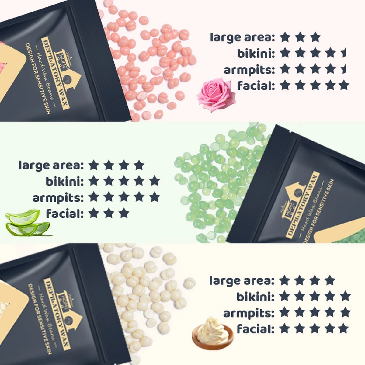 - Inclusief 3 zakjes wax beans: Pink Rose, Cream, Aloë