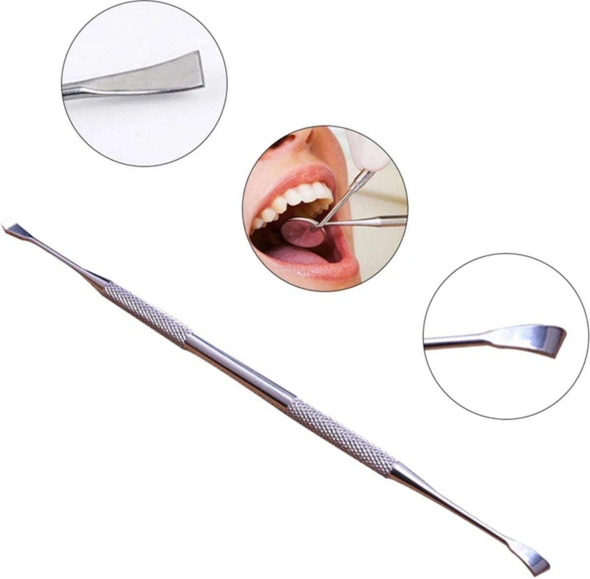 Handig stukje gereedschap van roestvrij staal om zelf tandsteen te verwijderen. Schraap van het tandvlees af en reinig het gebit in gedeeltes. U kunt deze tool ook gebruiken om het gebit van uw huisdier (hond of kat) te reinigen.
