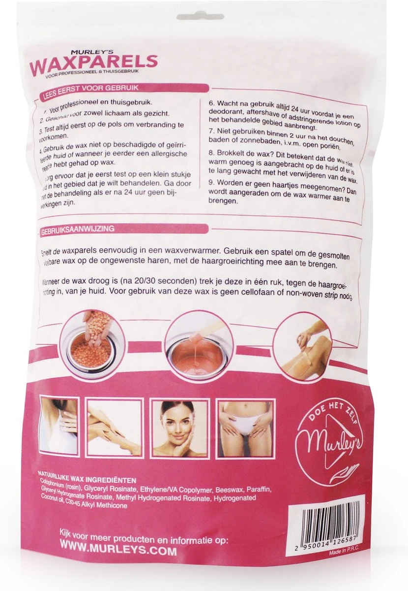 Belangrijke tips van MURLEY’S: om brokkeling te voorkomen moet de wax maximaal 20/30 seconden op de huid blijven. Zo blijft de wax nog soepel zodat je het in 1 makkelijke beweging eraf kunt trekken. Als het niet alle haartjes meeneemt probeer dan de wax wat warmer te smeren op de huid, maar test het altijd eerst op de pols zodat het niet te heet is. Kijk ook goed welke richting de haargroei is; als het meerdere richtingen heeft probeer dan ook alle richtingen tegen de haargroei de wax af te trekken. Als het helemaal geen haartjes meeneemt dan doe je vaak iets niet goed: of de huid/haren zijn vettig of de omgeving is niet droog waardoor de haartjes niet tussen de wax komt en aftrekt.