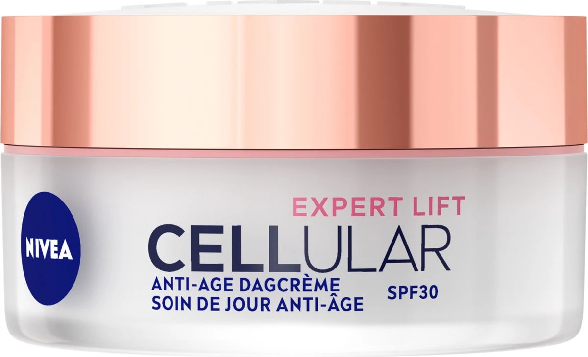 NIVEA Cellular Expert Lift Anti-Age Dagcrème SPF30 50ml bevat een combinatie van krachtige anti-age ingrediënten die diep in de cel werken. Een jonger uitziende huid is een zichtbare weerspiegeling van cellulaire activiteiten. PURE BACKUCHIOL: Bakuchiol is een ingrediënt van plantaardige oorsprong, afkomstig van de Babchiplant (Psoralea corylifolia). Bakuchiol heeft veel functionele gelijkenissen met het ingrediënt Retinol. Het ondersteunt de collageenproductie van de cel, vermindert diepe rimpels, verstevigt de huid en laat de huid glad aanvoelen. Bakuchiol wordt bovendien beter verdragen door de huid en is daardoor geschikt voor alle huidtypes, ook de gevoelige huid. Daarnaast beschermt Bakuchiol de huid beter tegen schade door vrije radicalen dan Retinol*. MICRO & MACRO HYALURONZUUR: 2 anti-age ingrediënten, die er om bekend staan dat ze huid hydrateren, glad maken en helpen om rimpels zichtbaar te verminderen. Macro hyaluronzuur helpt het huidoppervlak intens te hydrateren en glad te maken, door tot 1000 keer het gewicht in water vast te houden. Micro hyaluronzuur dringt nog dieper door in de huid, waardoor een rimpels worden verminderd. De dagcrème bevat SPF30 UVA/UVB zonnefilters, voor een optimale bescherming.
