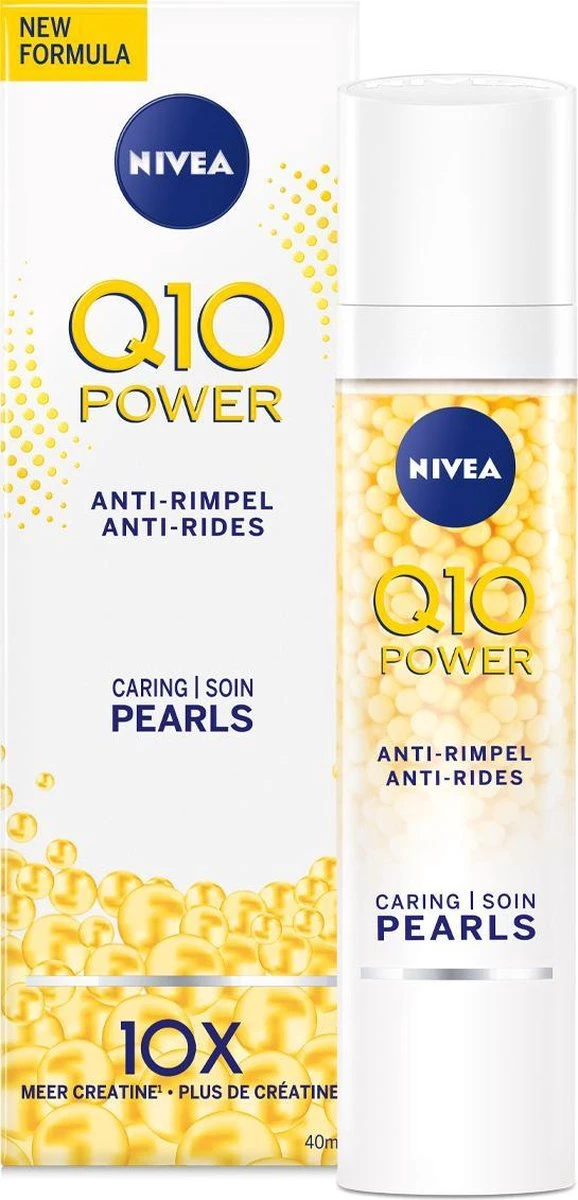 NIVEA Q10 POWER Anti-Rimpel + Verstevigende Caring Pearls bevatten de hoogste concentratie Q10 binnen de NIVEA Q10 POWER lijn en zijn gecombineerd met een hydraterende gel. Het resultaat: Een zeer effectief anti-rimpel product. De formule met het krachtige antioxidant Q10 en Creatine, zorgt voor een stevigere huid en verminderd rimpels zichtbaar.