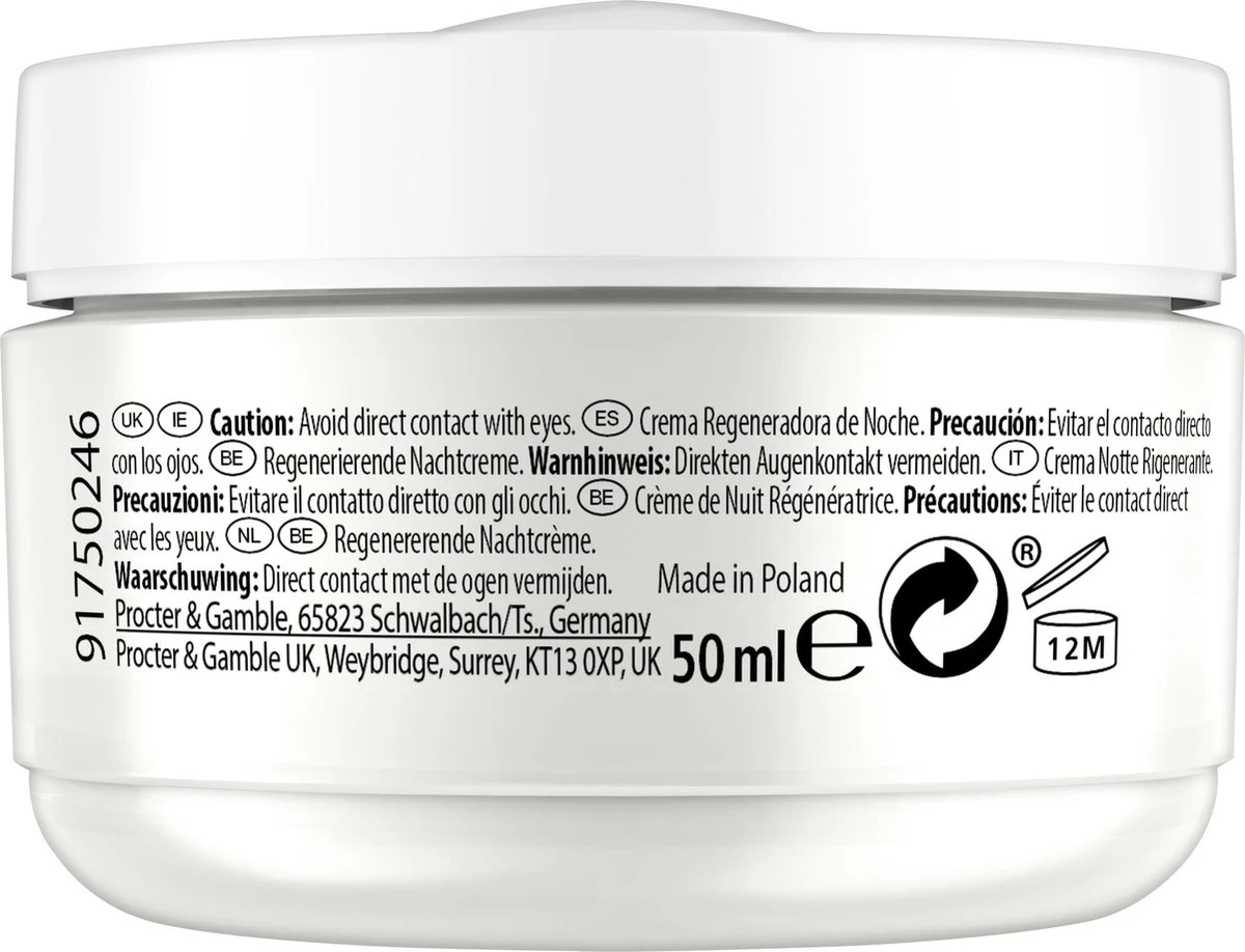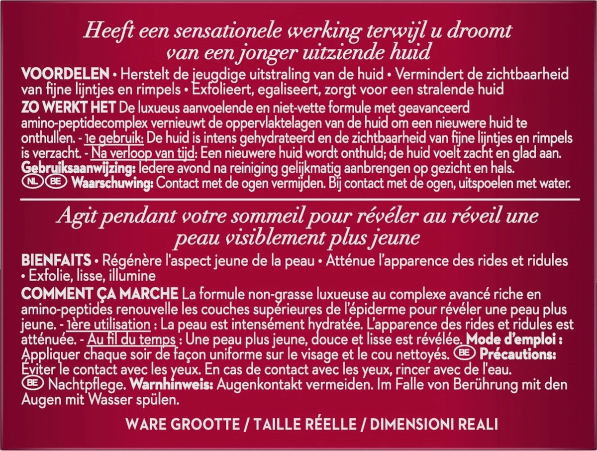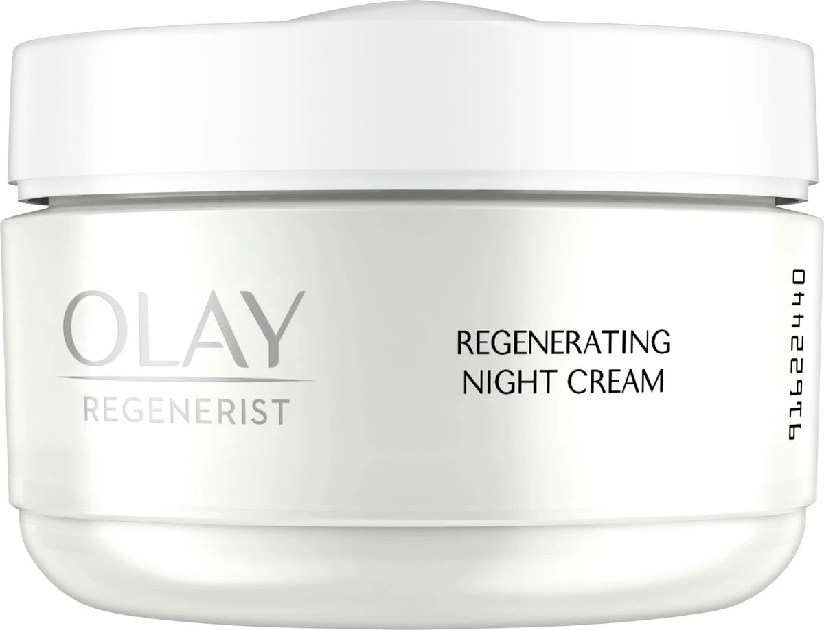Olay Regenerist Regenererende Nachtcrème werkt als een droom voor een jonger uitziende huid. Herstelt de jeugdige uitstraling van de huid. Vermindert de zichtbaarheid van fijne lijntjes en rimpels. Exfolieert, egaliseert, zorgt voor een stralende huid. Luxueus gevoel en niet-vettige formule met geavanceerd amino-peptidecomplex vernieuwt het huidoppervlak en onthult een nieuwere huid. 1e gebruik: de huid wordt intens gehydrateerd en fijne lijntjes en rimpels zijn zichtbaar verzacht. Na verloop van tijd: Een nieuwere huid wordt onthuld; huid voelt zachter en gladder aan.