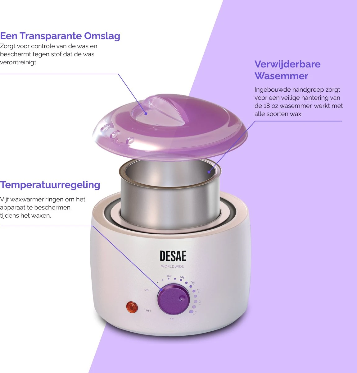 Dankzij onze alles-in-één Premium Wax Ontharen set van DESAE voor thuis kan je makkelijk en snel professioneel ontharen. Bespaar tijd en geld op ontharing met dit wax apparaat. Geen geld meer aan dure epilaties, geen sterk terug groeiende haartjes en geen irritatie en geen stoppels meer want jij verdient een geweldig gladde huid!