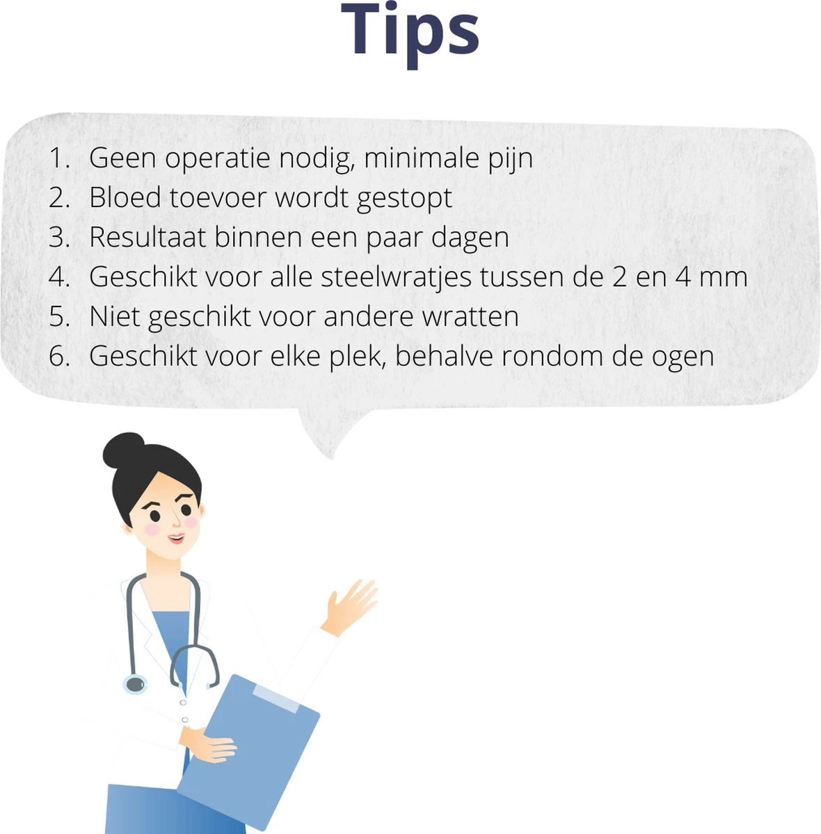 - De tool is enkel en uitsluitend te gebruiken op steelwratjes. Normale wratten en moedervlekken zijn uitgesloten.