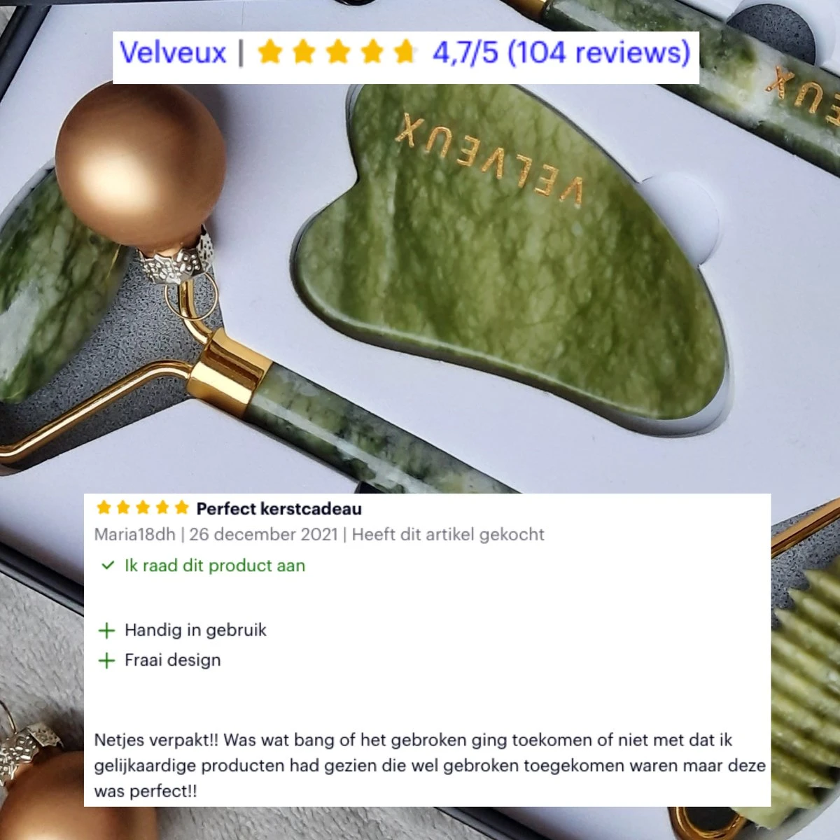 Bestel nu jouw Jade roller en Gua Sha set van Velveux en ervaar zelf de magie van deze krachtige routine.