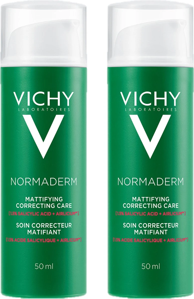 *Cosmeto-klinische studie, 50 vrouwen, 2 maanden. Ingrediënten van Normaderm Hydraterende Dagcrème Met salicylzuur, een ingrediënt dat mild exfolieert en onzuiverheden tegengaat, en Airlicium, een innovatie van Vichy dat overtollig talg absorbeert voor een mat resultaat.