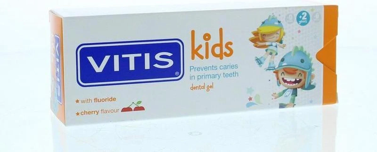 Vitis Kids Tandgel is een tandpasta die speciaal ontwikkeld is om melktanden in de fase van het wisselgebit gezond te houden. De tandgel is geschikt voor kinderen vanaf 2 jaar. Dankzij de actieve stoffen natriumfluoride en xylitol, helpt VIitis Kids Tandgel preventief tegen gaatjes en herstelt de gel het tandglazuur. Vitis Kids Tandgel heeft een aangename frisse kersensmaak waardoor kinderen al op vroege leeftijd een goede en plezierige poetsgewoonte aan kunnen leren.