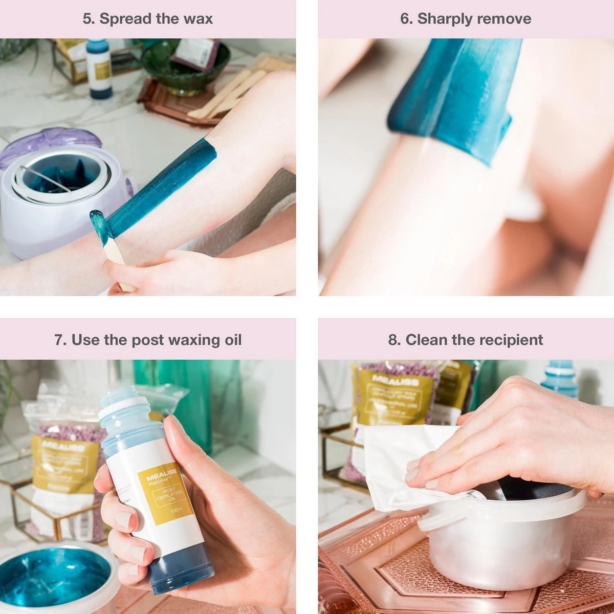 ➔Na het epileren, de restjes wegnemen met warm water of een lotion. Vervolgens olie of crème op uw huid doen om uw huid te kalmeren en hydrateren. Niet meteen blootstellen aan de zon, een paar uurtjes wachten