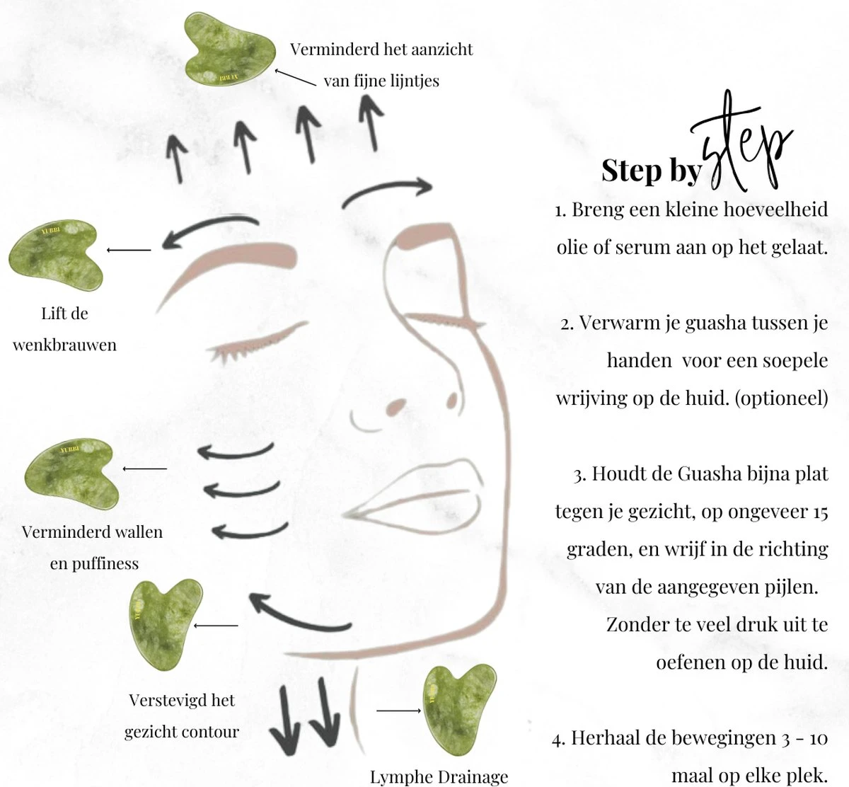 De platte jadesteen met gebogen zijkanten wordt zachtjes langs je gezicht gedrukt en beweegt naar boven en naar buiten. Guasha kan ook worden gebruikt voor je grotere spieren, zoals gebieden op je schouder. Gebruik de platte steen en het helpt pijn en stijfheid te verlichten.